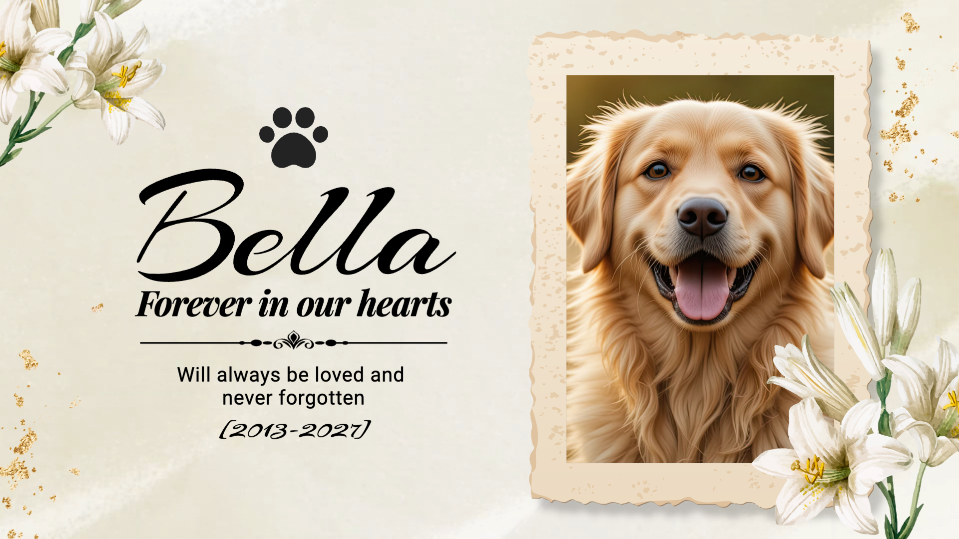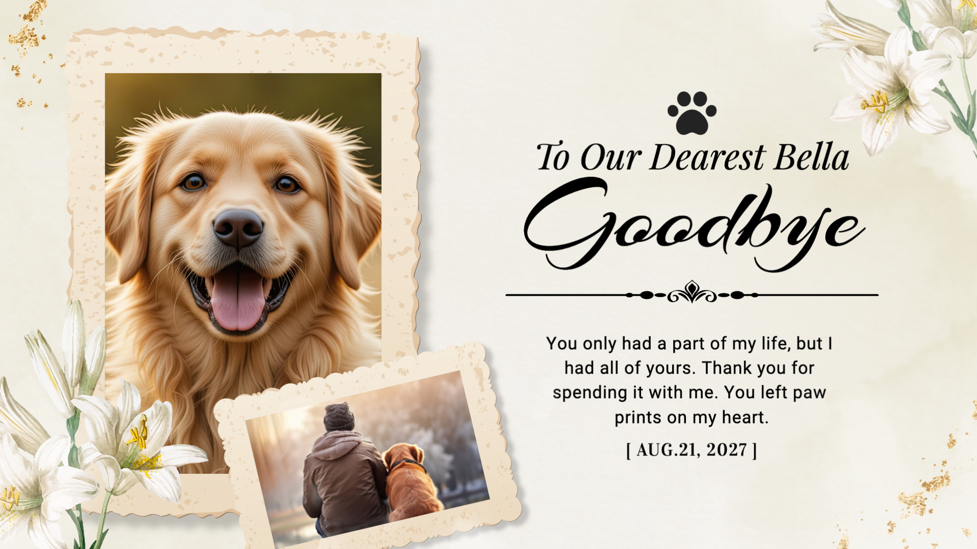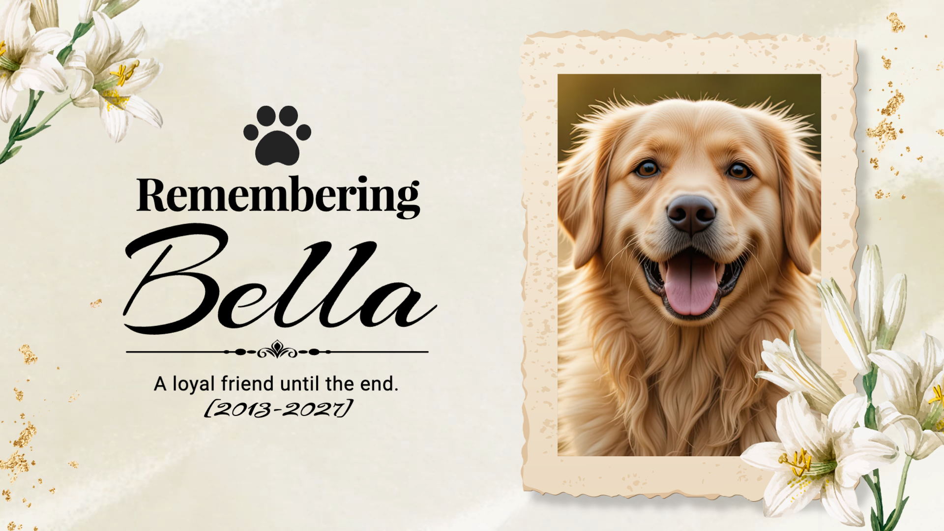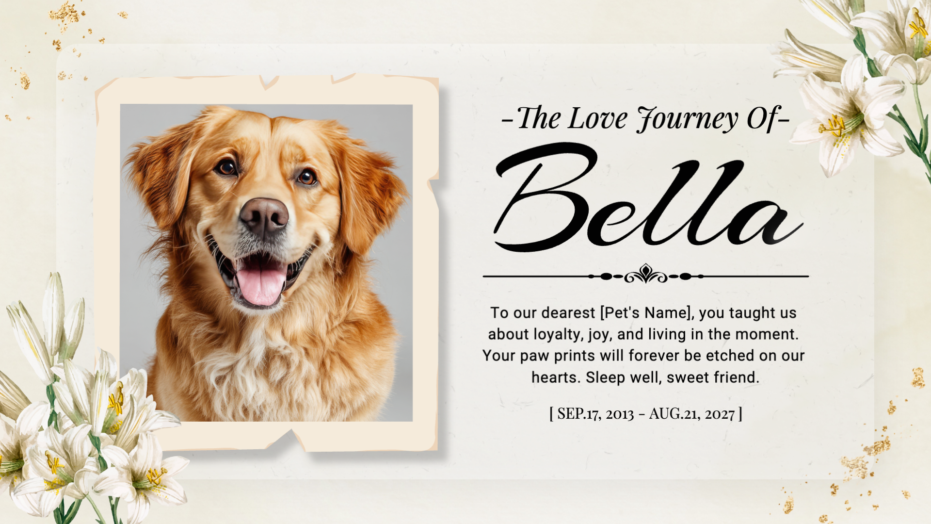 Pets are our best friends and beloved family members. They bring joy into our lives, making our days more colorful! If you need to say goodbye to your beloved pet who recently passed away, this pet memorial template created by FlexClip is here for you.