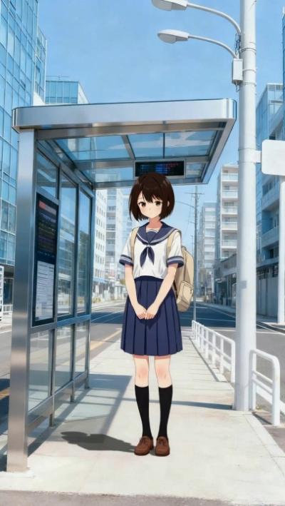 Blend Anime and Reality Girl with Anime Style Waiting at the Bus Stop