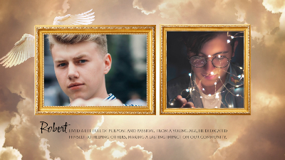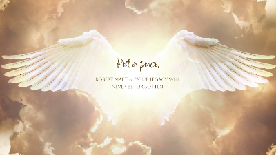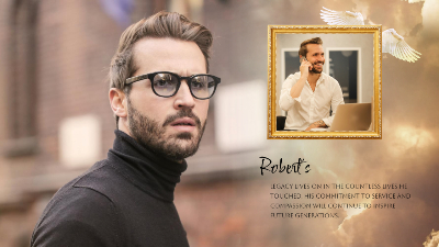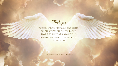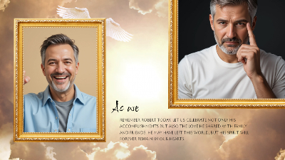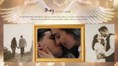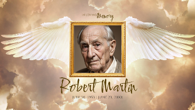 This is a golden funeral template, with angel's wings as its background, featuring a peaceful and calm style. You can use this template and create your own memorial slideshow.