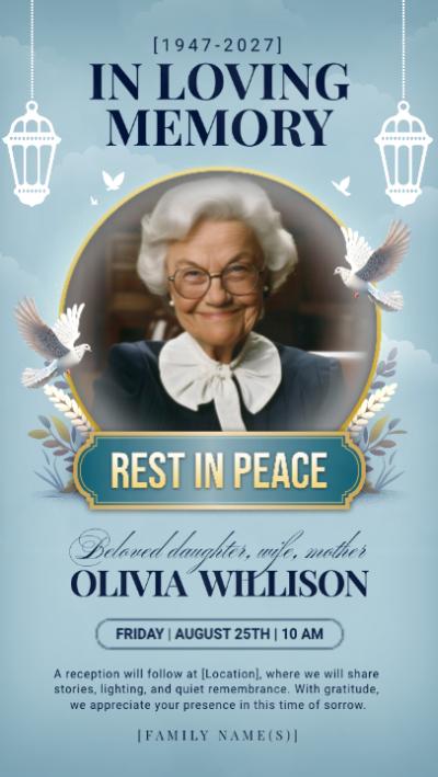 If you don't want black and white funeral invitation cards, this blue-gray invitation card video from FlexClip might meet your needs. It features dreamy and heaven-like decorations, representing the most sincere remembrance and blessings for the deceased.