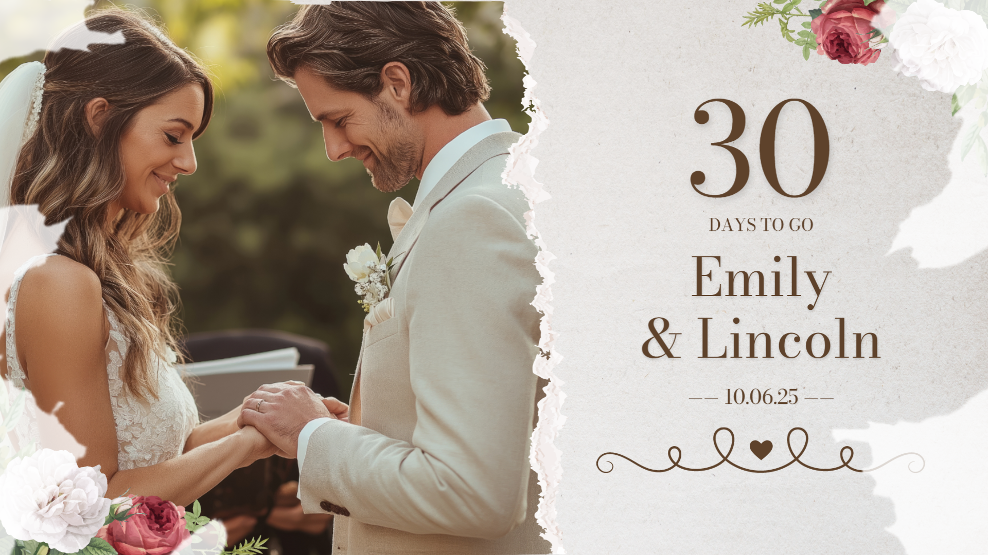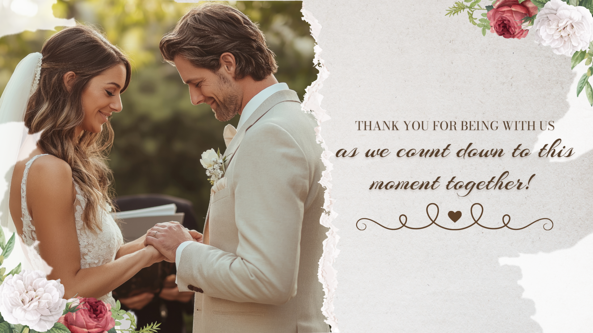 Weddings require thorough preparations in advance. As the wedding date approaches, both the newlyweds and their families will become more and more excited. Come and use this FlexClip wedding countdown template. Let's all look forward to the arrival of happiness together!