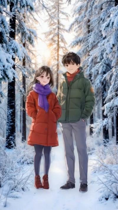 Blend Anime and Reality Couple Hug Embrace in the Snowy Wood