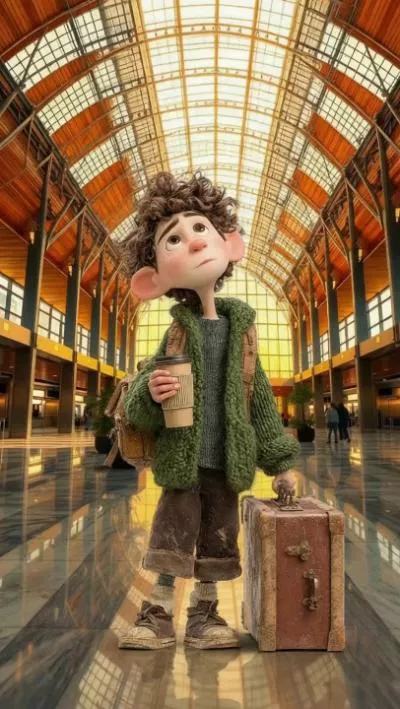 Blend Anime and Reality Boy Holds Suitcase and Coffee at the Anime Train Station
