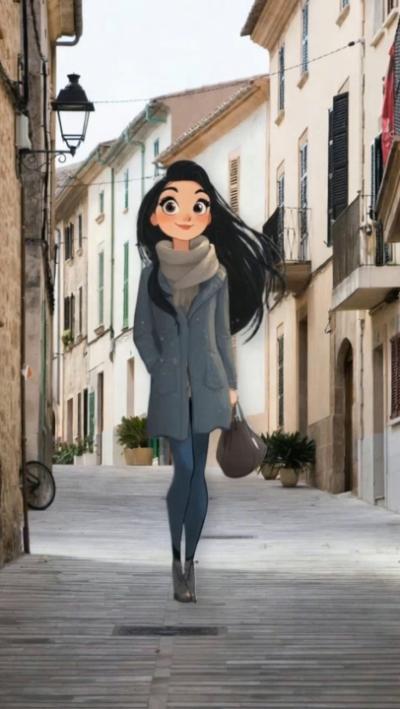 Blend Anime and Reality Girl Walk on Anime Street in Her Coat